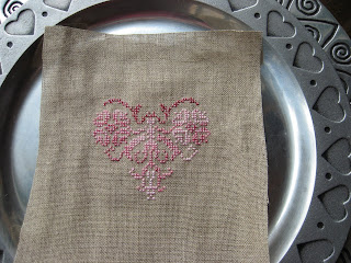 I stitched it in a variegated pink/burgundy DMC, using one strand of floss and one strand of a DMC pink "pearlescent effects" thread. Since it's supposed to be for a Christmas tree, I wanted it to have some glitter, but this combo did't shine the way I had hoped it would. I think two strands of floss with some glittery blending filament would have been better.