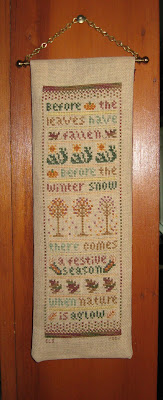 Having never finished a bellpull in my life, I'm no help! Just want to say what a pretty piece this is. Autumn things are my favorites to stitch. Good luck figuring out the corner... What about sewing some sort of trim or fringe along the bottom if you can't get it to suit you?