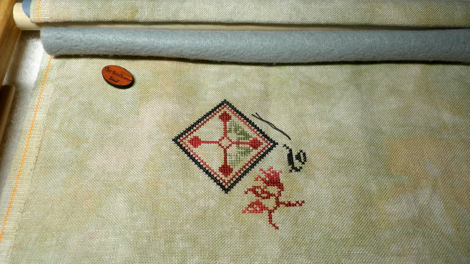 I'm using Belle Soie silks colors Old Crow, Poison Apple and Herb Garden. The fabric is PTP Heritage.