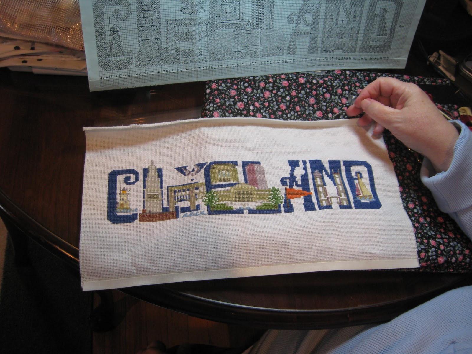 Aww look at all the beautiful WIPs. Can you please ask Linda who is the designer on that "Cleveland" piece? My husband and I both grew up in Cleveland and most of our family is there, what great gifts this would make, especially for those my two aunts living out of state.