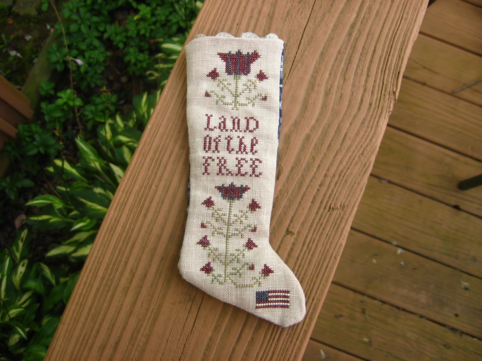 I have a couple new bits of stitching to show you. The first is from Plum Street Samplers' newest, Betsy's Stockings. It was super fun to stitch. And if you buy a fat-eighth, you can fit all three stockings onto it.