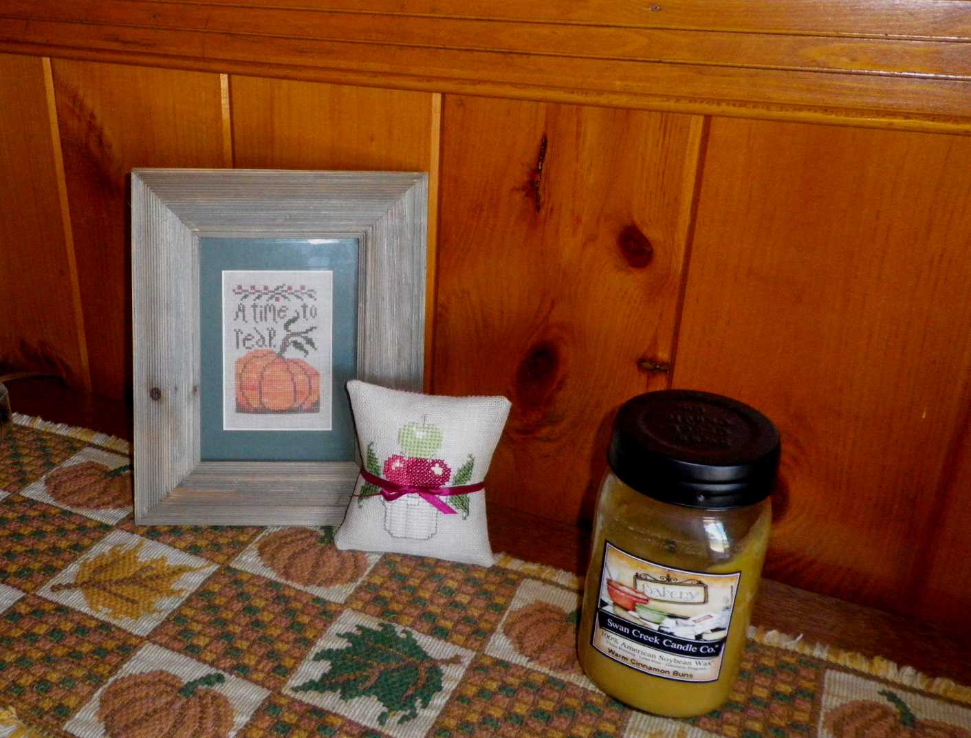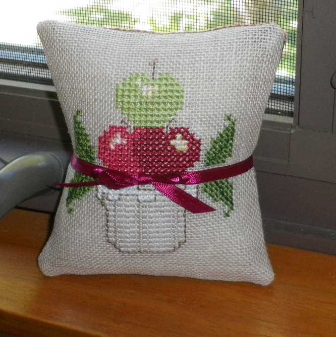 I finished it as a very basic cushion. For some reason the design has the apples kind of floating above the basket, so I added a ribbon.
