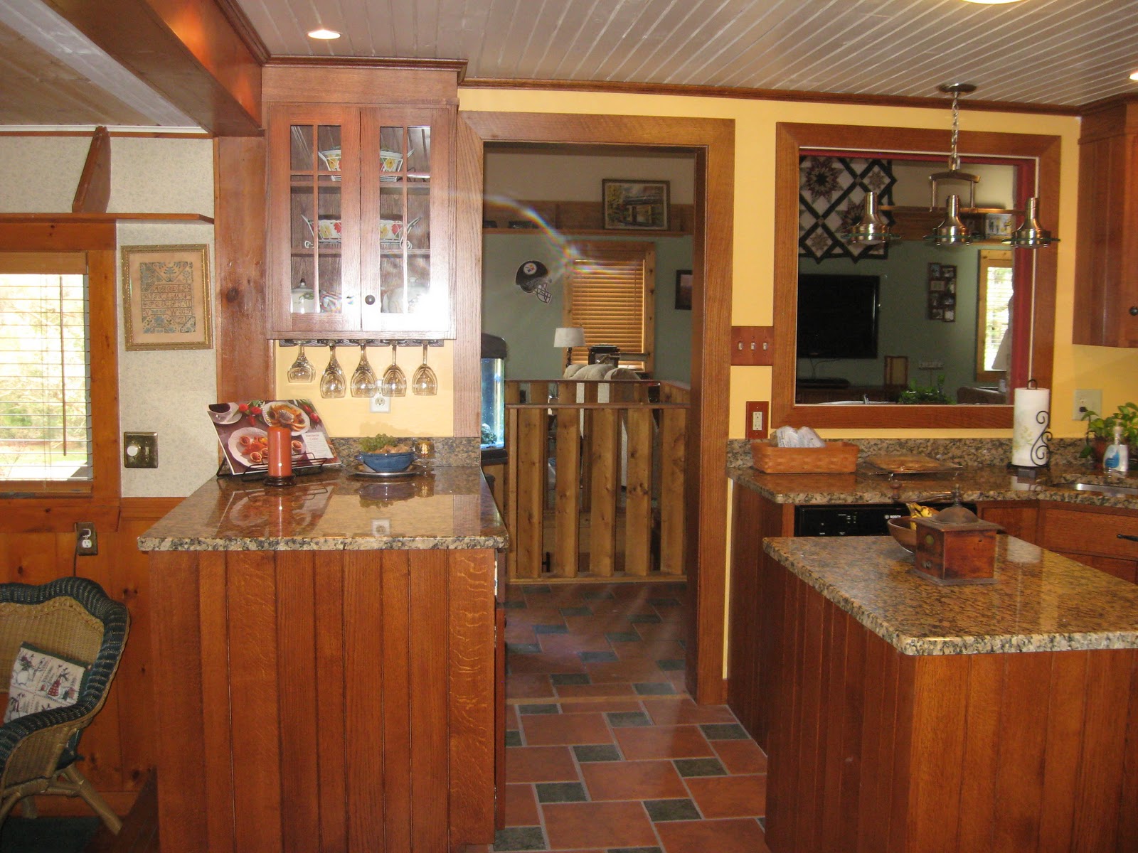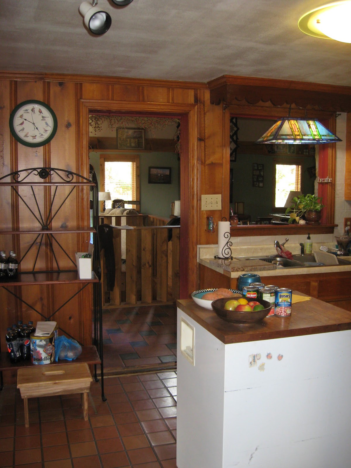 And here is after.The dishwasher is built in and replaced by a rolling center island. We replaced the drywall ceiling with tongue and groove pine, added recessed lighting in the ceiling and under cabinet lighting. We replaced the Burger King vinyl with ceramic, bought when we added the family room nine years ago. And lucky us...there was just enough.