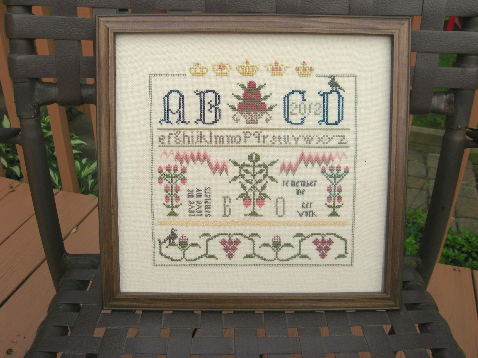 Happy Tuesday everyone! I hope you all had a weekend that was a nice as mine. It certainly started off well, with a visit to the framers' to pick up Antique Sampler. I had finished this back in March or some time around then. I went with a very plain frame this time and no mat. I like the results.