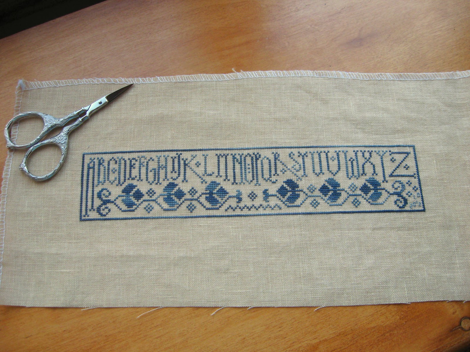 Last night I finished ABCD, by La D Da. The original version is black. My version is blue (Belle Soie Mer Blue, to be exact). And I've seen some awesome reds. It's also been my first attempt with 40 ct linen and I have just one word. LOVE. I used 40ct. Examplar linen and it was fabulous.